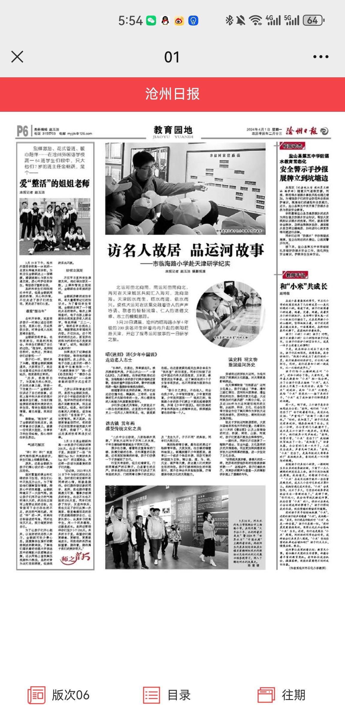 沧州日报4月1日第6版,报道了我校“大手拉小手、水利科普并肩走”暨2024年“世界水日”“中国水周”主题科普活动。(供稿单位:科技处)