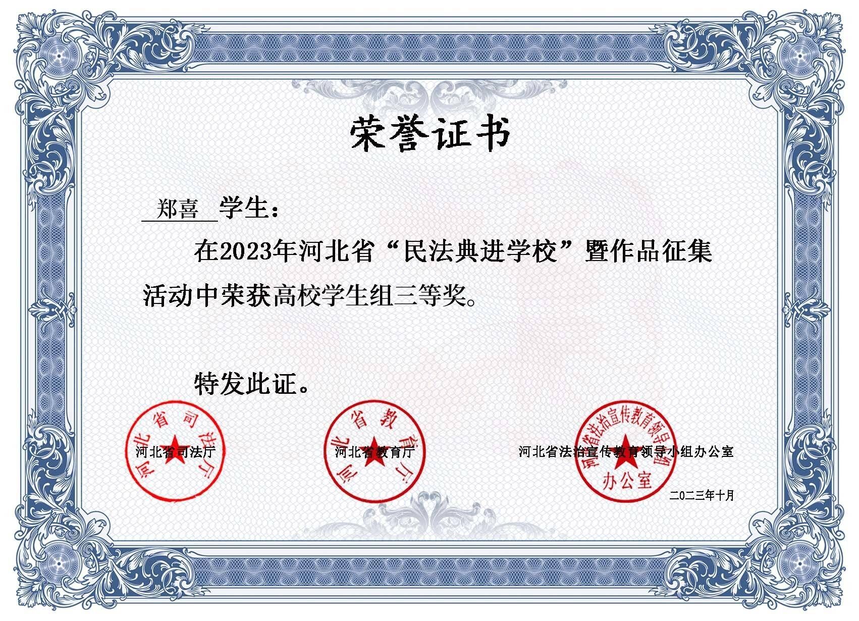 法与时转则治,治与世宜则有功。为深入学习贯彻习近平法治思想,深化民法典学习宣传,加强青少年民法典教育,引导学院广大师生学深、学懂、学透民法典精神,按照2023年“美好生活·民法典相伴”主题宣传活动要求和“每月一主题”普法宣传活动安排,2023年6月至8月,我校按照省司法厅、省教育厅、省法治宣传教育领导小组办公室要求组织开展了“民法典进学校”暨作品征集活动。通过层层评选,我校王玉洁老师和土木系郑喜同学于9月28日参加河北省“...