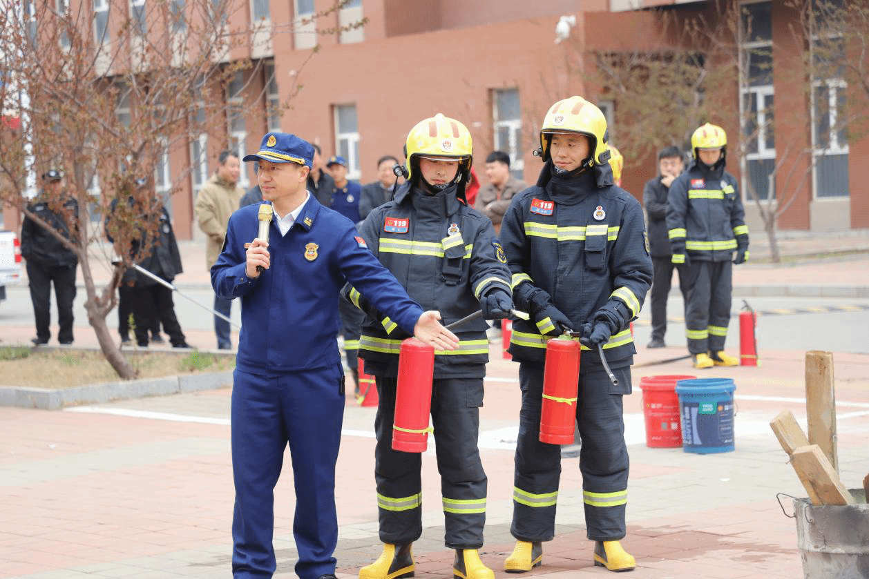 点评结束后,赵江奎和8名消防员通过解说和现场演示的方式为师生员工详细讲解了灭火原理、四种灭火方法、灭火器的种类和使用方法,随后,全体参演人员使用灭火器进行了灭火。