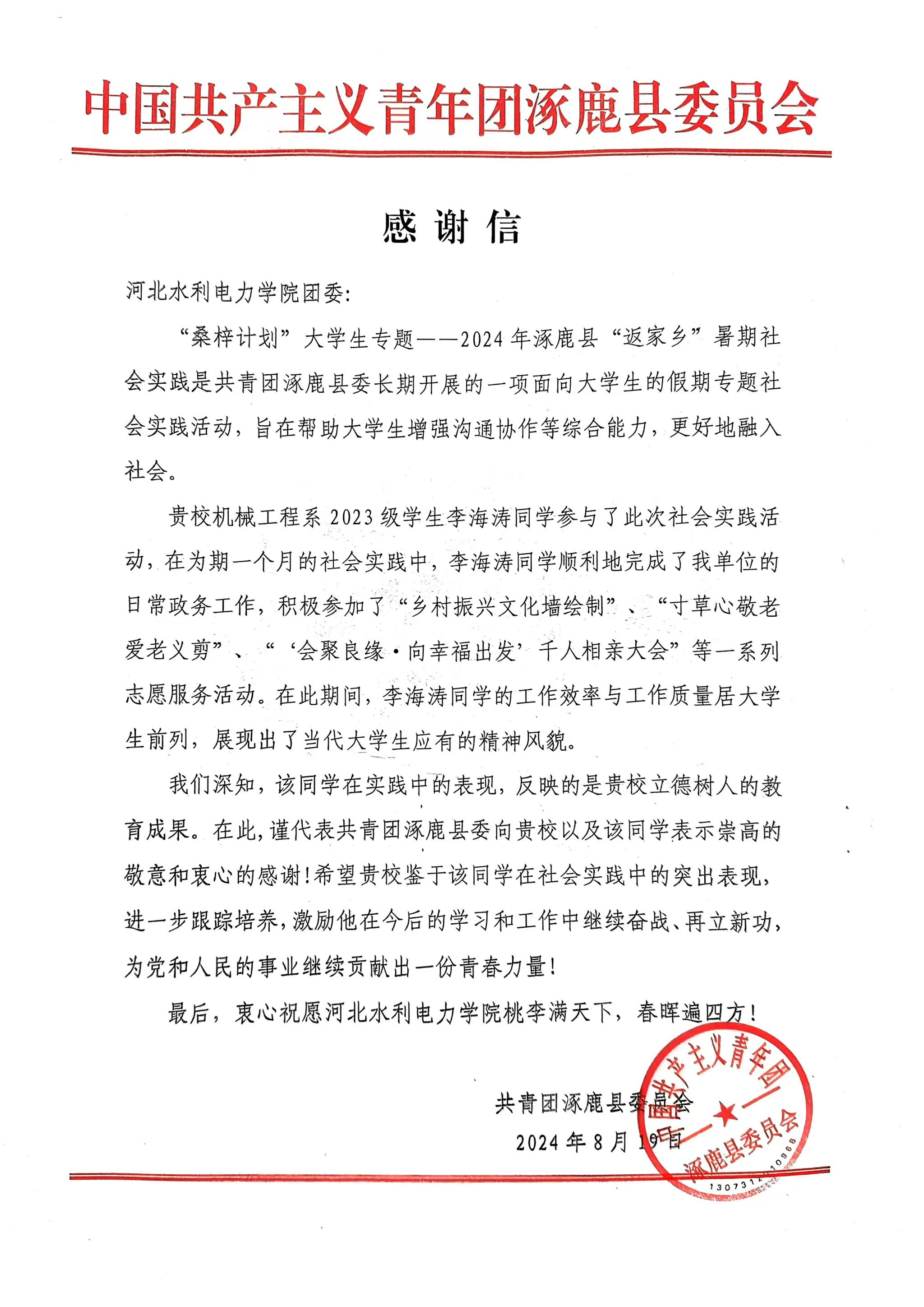 近日,社会实践工作传来喜讯,机械工程系学生李海涛在今年暑期社会实践活动中表现突出,荣获张家口涿鹿县共青团委的高度评价与表彰,被授予“优秀志愿者”荣誉称号,并收到涿鹿县共青团委的感谢信