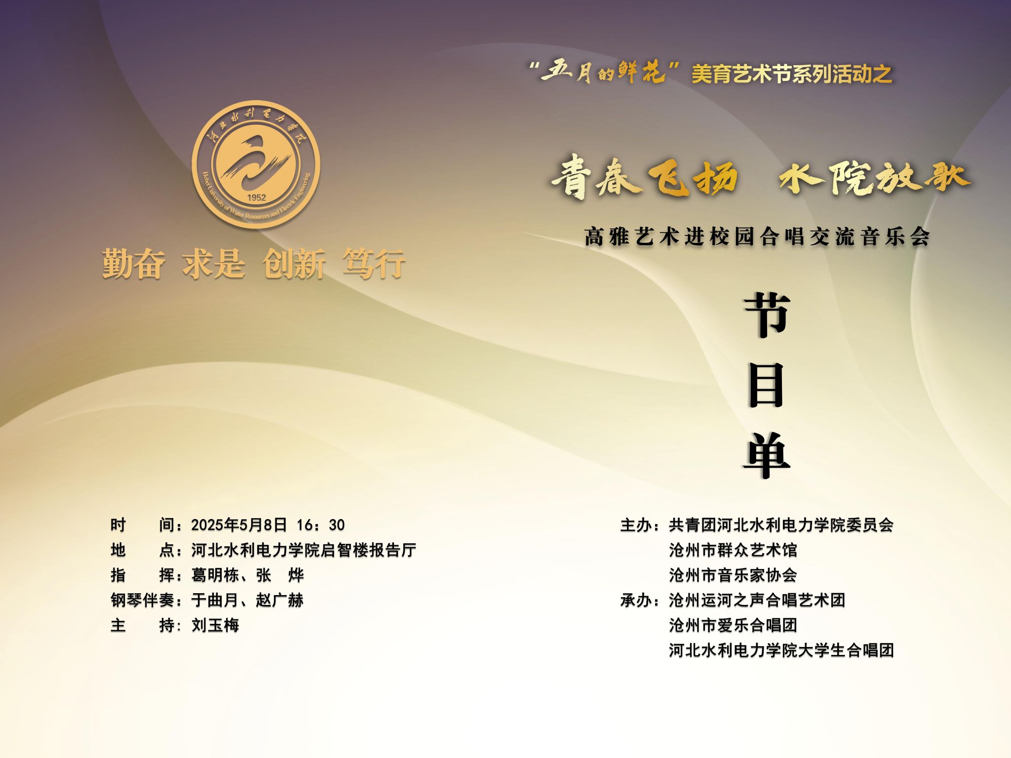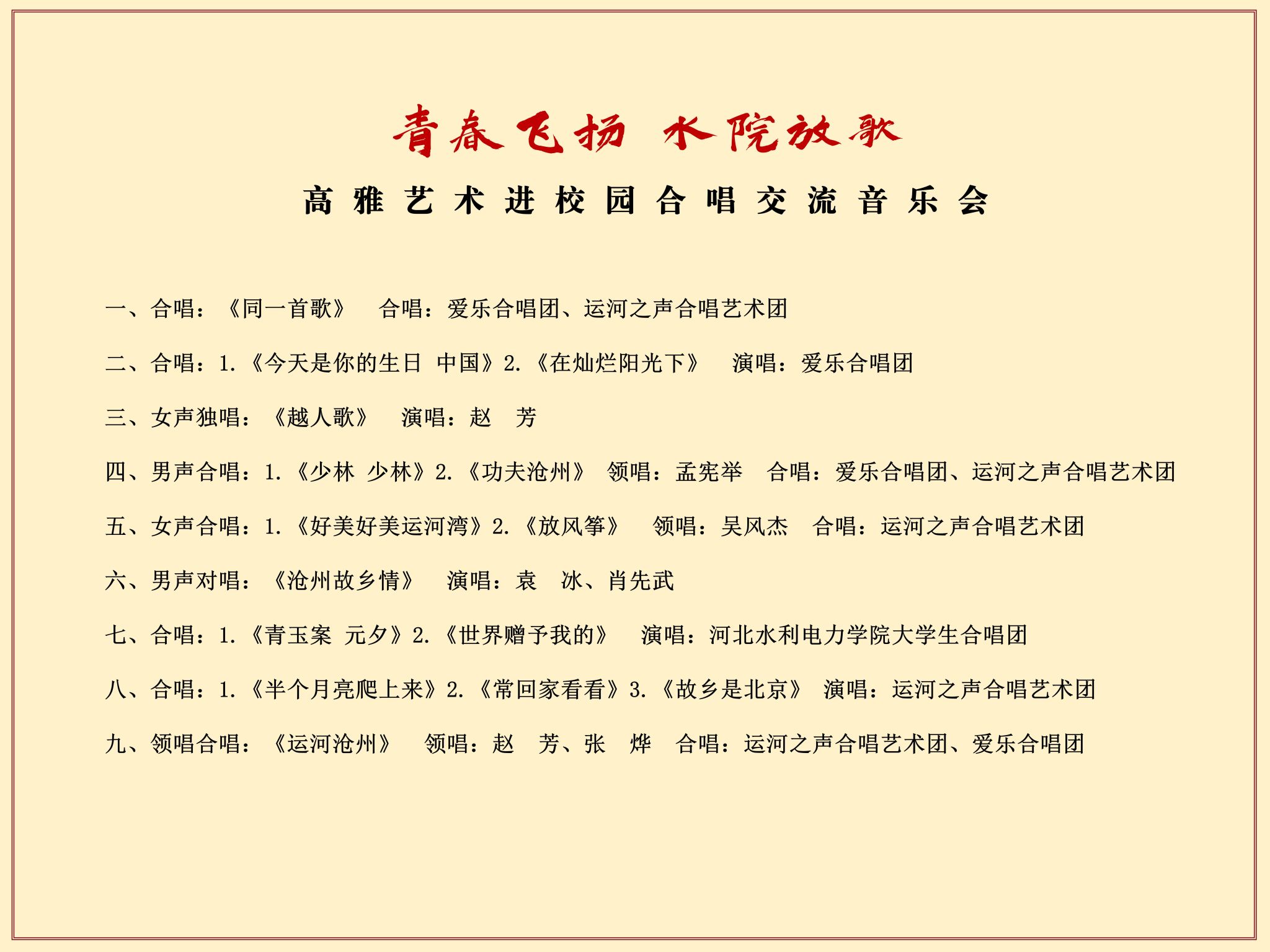 为深入学习贯彻党的二十大精神,进一步加强我校美育工作,创建美育特色品牌,全面提升校园文化建设水平,校团委联合沧州市群众艺术馆、沧州市音乐家协会等单位,举办“五月的鲜花”美育艺术节系列活动,包括合唱交流音乐会、红歌展演、书画展览、舞蹈赏析、美育讲座等内容。现将首场演出——校园合唱交流音乐会演出节目单通知如下,欢迎广大师生踊跃参加。